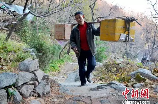 这段山路,年近半百的王荣泉已经走了30余年。背着百斤货物,他步履扎实地走过陡峭石阶,步子不快,身材削瘦,饱经沧桑的手渗着一层泥色,搭在扁担上控制平衡。“年轻时,我从中天门到南天门来回两个小时,现在年纪大了,走路慢了,来回要5个小时,只能担百来斤货物。”王荣泉边扛货边感叹着。