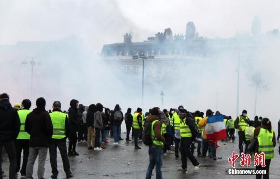 中新网12月4日电 (郭炘蔚 李弘宇)在刚刚过去的周末,浪漫之都巴黎变成了“伤痕累累”的战场。凯旋门上的雕像被砸坏,涂满了破坏性的涂鸦。防暴警察与抗议者对峙,街头石块飞舞,火光熊熊。