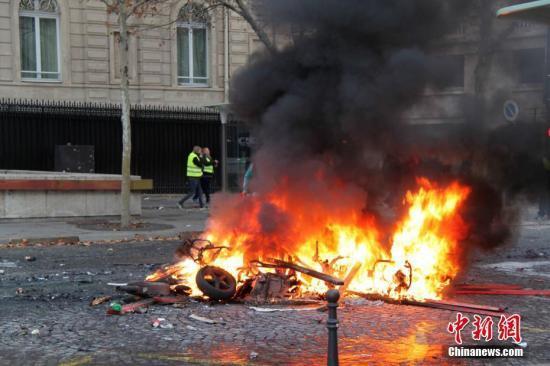11月24日,巴黎香榭丽舍大街遭遇大规模示威活动。数以千计示威者聚集在街上,设置了不少路障,街道交通完全陷入瘫痪。中新社记者 李洋 摄