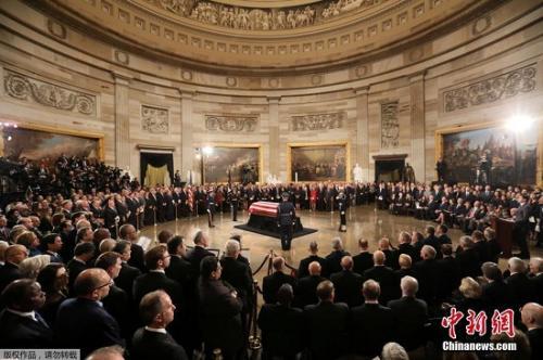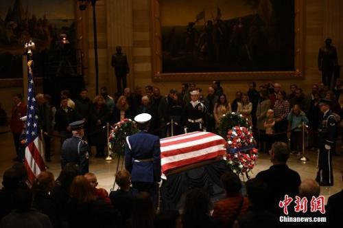 3日下午,美国官方为老布什的灵柩举行了简短而庄重的安放仪式。伴随着肃穆的军乐和礼炮声,覆盖着星条旗的灵柩由军事仪仗队抬入美国国会山圆形大厅,并安放在1865年为林肯总统的棺材所建造的灵柩台上。