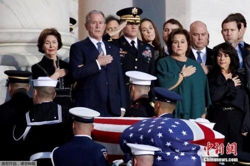 当地时间2018年12月3日,美国前总统老布什的灵柩送抵美国国会大厦。老布什之子,美国前总统小布什参加灵柩安放仪式。