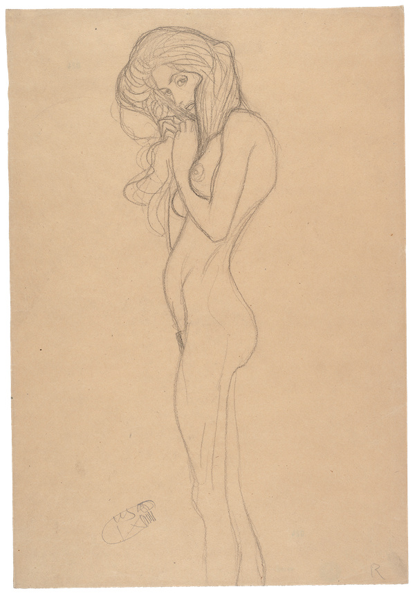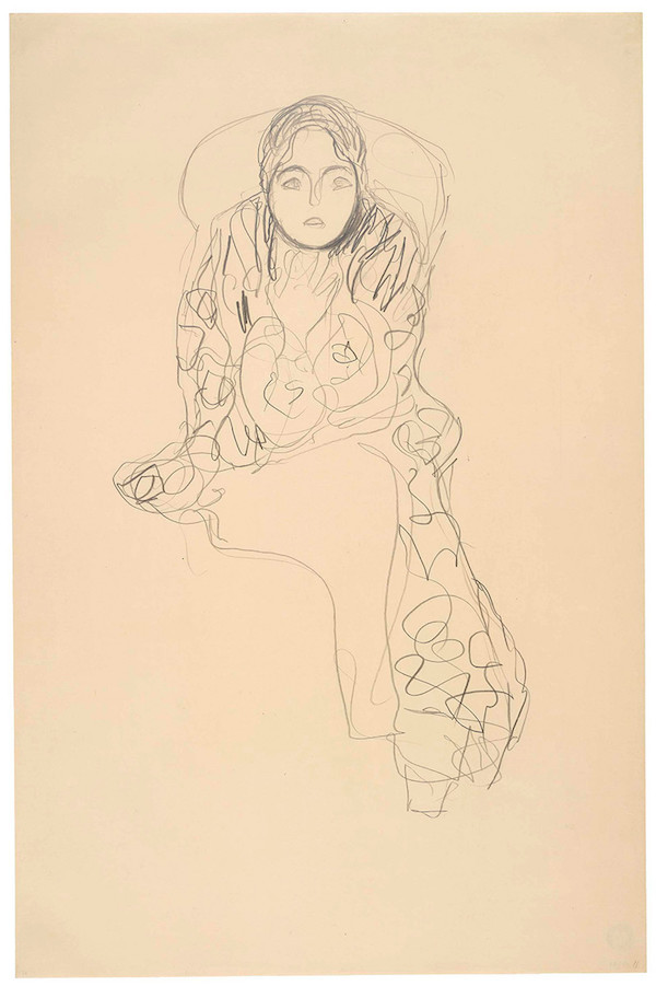 克里姆特的作品像是被数字化的裁剪,他的笔下瘦弱而蜿蜒的裸体,像是站在水中。席勒则走得更远,他擅长用墨水笔概括细长的身体,简洁到寥寥几笔便构成完整的肖像。