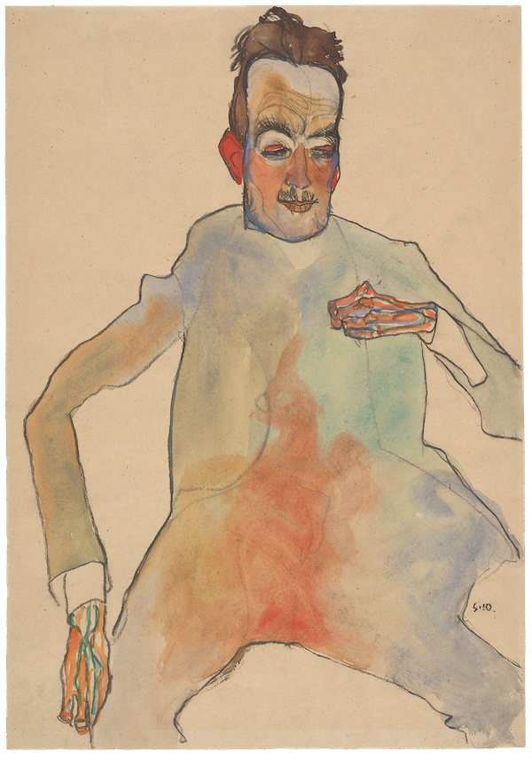 席勒的自画像往往带着一种自我殉难式的感性,有些作品中他以一个发带造成自己面部的扭曲;有时他裸露着身体,从几乎水平倾斜的头部凝视着画外。