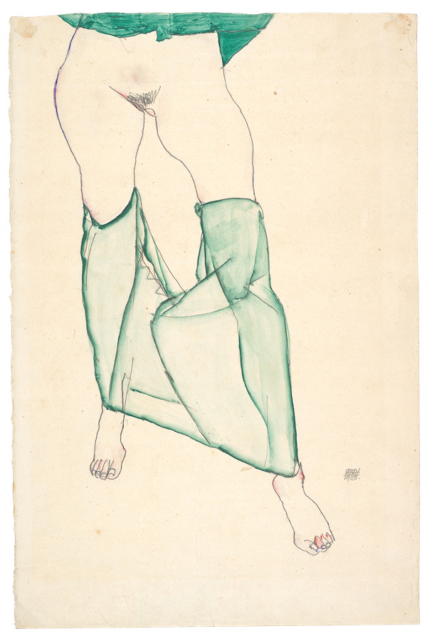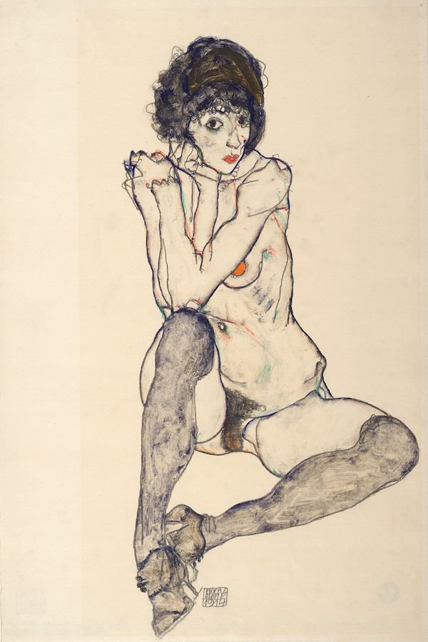 一个穿着黑色长袜的瘦弱女人,斜倚看着艺术家,露出她红色的乳头。既深情又色情。骨瘦如柴的模特的肉体带着奇幻的哥特色彩。观众可以在真实而坦率的记录中看到她人性的脆弱。 对于席勒而言,性是重要的,因为它是活着的证明。