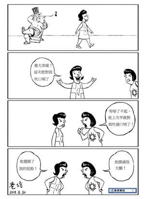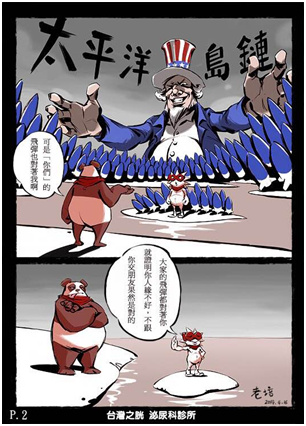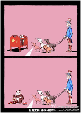 不过我认为,这种情况是可以改变的。大陆越来越强、越来越进步的话,文化影响力就会越来越大,久而久之总会产生影响的,所以我其实没有那么绝望。我认为两岸关系其实是比较单纯的,更麻烦的是外部力量的介入。如何防止外部力量捣乱,影响两岸关系发展,是最根本的问题。我的漫画里也因此常常出现一只代表美国的老鹰形象。现在台湾网络上有不少“反统”的声音,而我有很多不一样的话想讲,就通过漫画来表现。