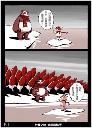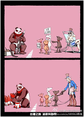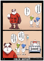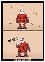 老培:有一幅作品是《熊猫成长史》,那个在网络上被转载得比较多,流传很广。熊猫代表中国大陆,从在婴儿车里一直成长到强壮的样子。那幅画创作的时间比较早,就是寄托中国越来越强的愿望。