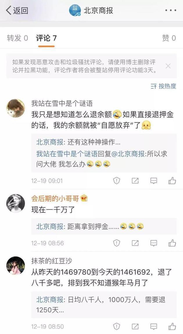 但追问到底最晚什么时候能退时,工作人员却表示无法确定,并解释称18日开始线上排队退押金。每天零点都会退一批人,剩下的人则会顺延到前面。