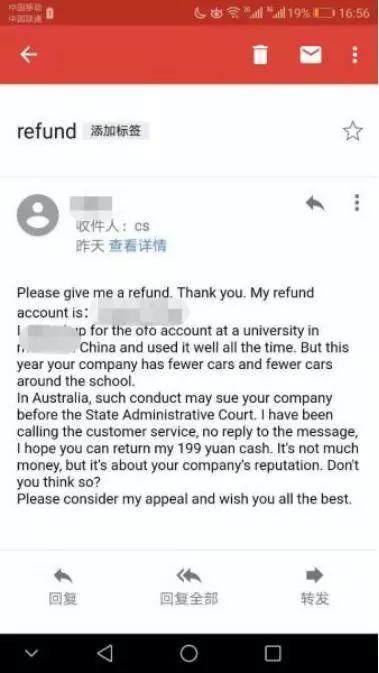 近日,网友@zjt93发称,通过假装是一名来自加州、在中国生活了两三年、中文不太好、做事喜欢上纲上线的外国人,在给ofo写了封投诉邮件后很快收到了退的押金,ofo还回复了一封英文邮件道歉。
