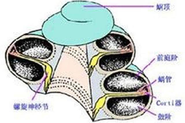 回答上面的问题,需要从耳蜗讲起。耳蜗是人内耳的一部分,形似蜗牛壳,是一个中空的螺旋形骨管,全长约30~32毫米,其内部充满液体。耳蜗螺旋管内共有3个管腔,分别是前庭阶、中阶和鼓阶,中阶又叫蜗管。前庭阶和中阶由前庭膜分隔,中阶和鼓阶由基底膜分开。前庭阶和鼓阶内充满外淋巴液,中阶内充满内淋巴液,前庭阶和鼓阶内的外淋巴液经蜗顶的蜗孔相通。位于蜗管基底膜上的螺旋器(Corti器)由毛细胞、支柱细胞和盖膜构成,是听觉感受器。