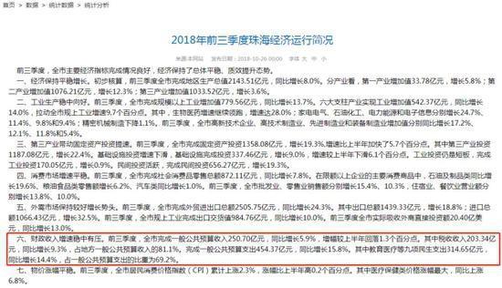 2018年前三季度珠海经济运行简况显示,前三季度珠海财政收入增速稳中有压。前三季度,珠海全市完成一般公共预算收入250.70亿元,同比增长5.9%,增幅较上半年回落1.3个百分点。
