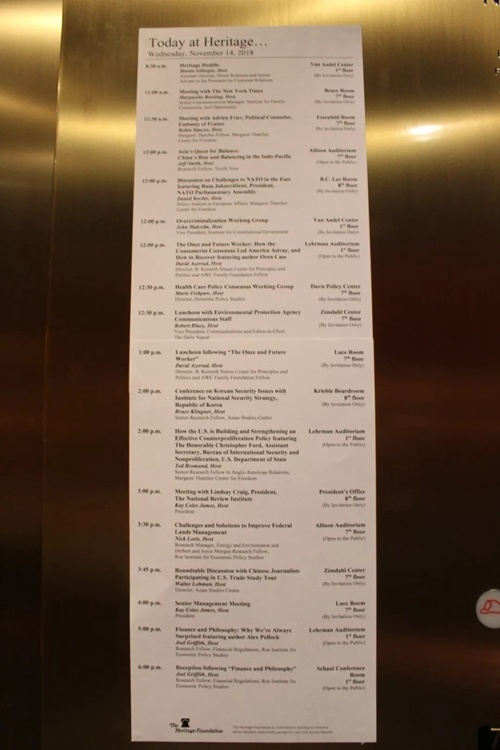 “智库街”犹如一个大舞台,各类交流活动轮番上演。平日里,《环球时报》记者订阅了几家美国智库的新闻邮件,每天都能收到数十封关于活动预告、讲座简报、出版物介绍等相关内容的邮件。走访“智库街”之前,记者常常想,这里当真有这么多活动吗?走进马萨诸塞大道214号的美国传统基金会的电梯间,记者一下傻了眼。电梯正中间贴了一张一米多长的日程表,密密麻麻地写满了当天的活动安排。从早上8时30分到下午6时,足足有18场交流活动,包括接受中国媒体采访以及主题为“中国崛起与印太平衡”的讨论会。