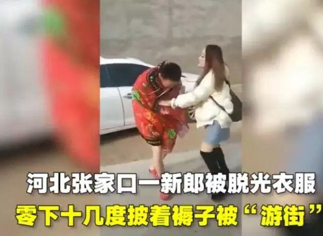 2018年12月7日,河北张家口万全区,一新郎被亲友脱光衣服披着褥子“游街”,当时气温在零下17度左右。目击者称,这是当地的习俗,结婚办事都要逗一逗新郎新娘。