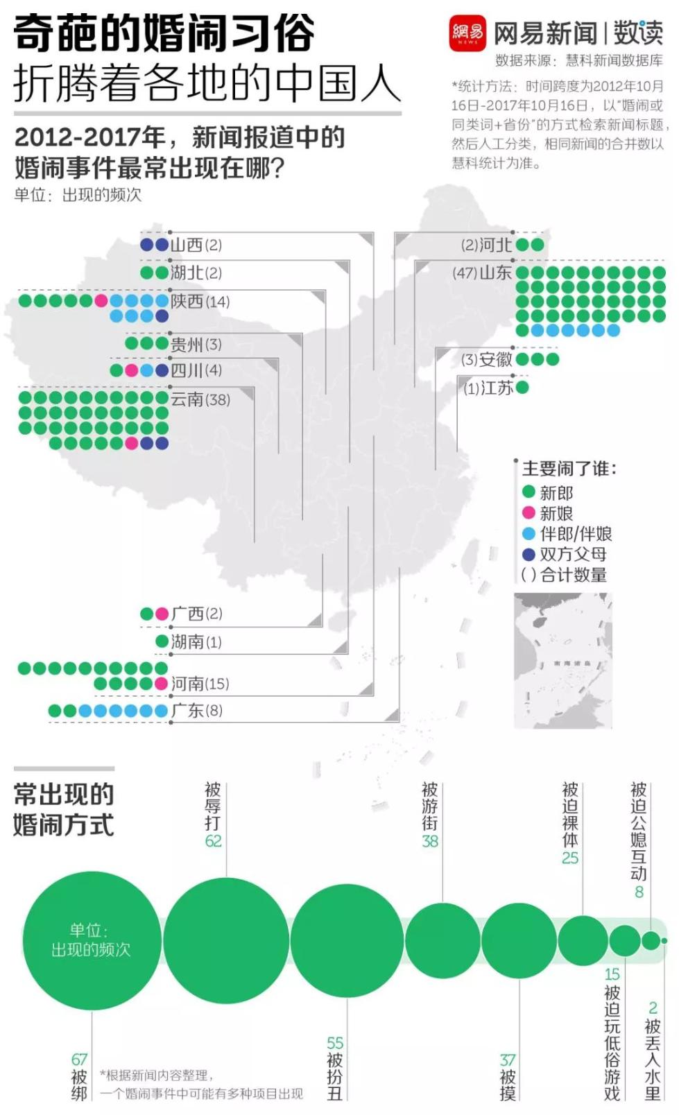 根据慧科新闻数据库的一份闹婚调查报告显示,2012-2017年我国婚闹现象最严重的省份在山东省、其次是云南、河南等地,闹婚对象最主要是新郎、其次是伴郎、伴娘以及新娘和双方的父母,采取闹婚的方式最多的是捆绑辱打和被扮丑,其次是被游街、被摸、被迫裸体,最少的是被迫玩低俗游戏、被迫公媳互动、被丢入水里等。