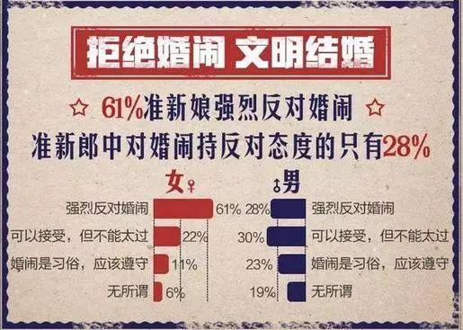 根据一家婚礼APP发布的2017年用度调查发现,61%准新娘强烈反对婚闹,相对来说,准新郎持强烈反对态度的仅28%,女性对婚闹新闻表现出更强烈的厌恶。