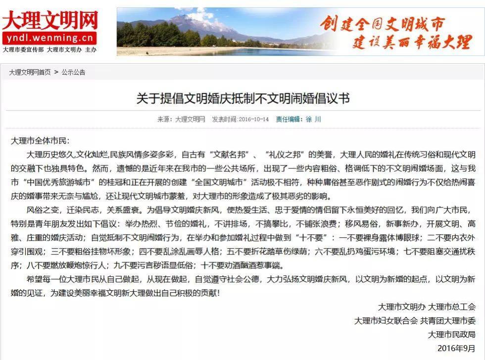 为了抵制“低俗闹婚”行为,2016年云南大理就曾发出过“十不要”倡议。