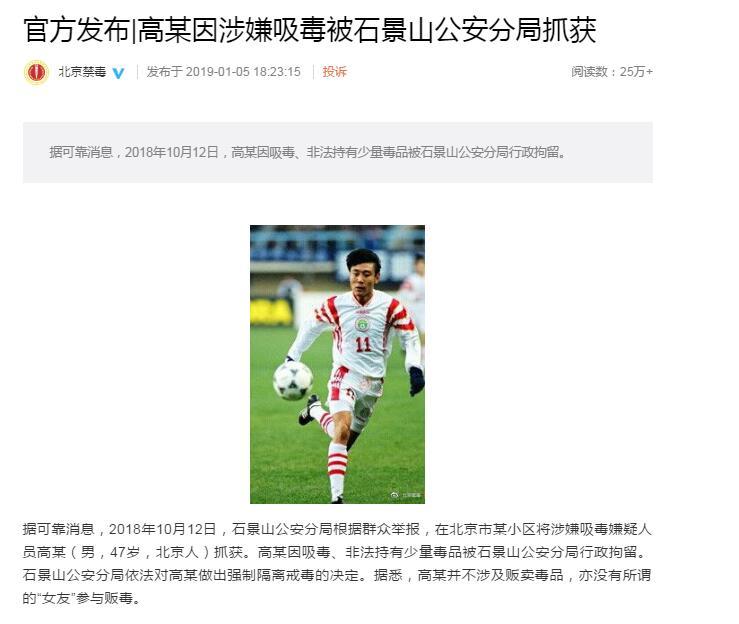 1月5日,国家禁毒委员会办公室官方微博发布消息称:1月4日,有人在微博爆料,前国脚高某与其女友因涉毒被警方抓获,还有人爆料称高某被捕原因是参与贩毒。中国禁毒微博澄清真相:高某因在社区戒毒期间再度吸食冰毒被抓,被行政拘留14日,同时强制隔离戒毒二年。高某无贩卖毒品情况。