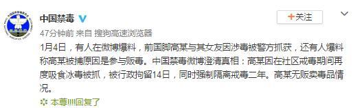 随后,北京禁毒志愿者总队官方微博发布文章:据可靠消息,2018年10月12日,石景山公安分局根据群众举报,在北京市某小区将涉嫌吸毒嫌疑人员高某(男,47岁,北京人)抓获。高某因吸毒、非法持有少量毒品被石景山公安分局行政拘留。石景山公安分局依法对高某做出强制隔离戒毒的决定。据悉,高某并不涉及贩卖毒品,亦没有所谓的“女友”参与贩毒。