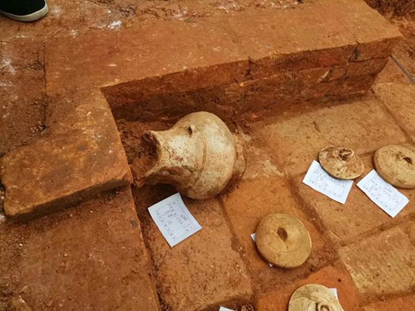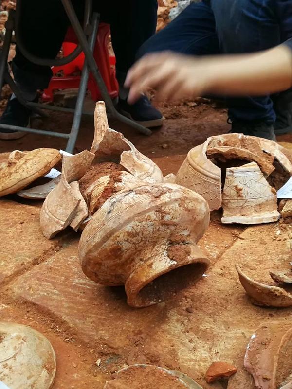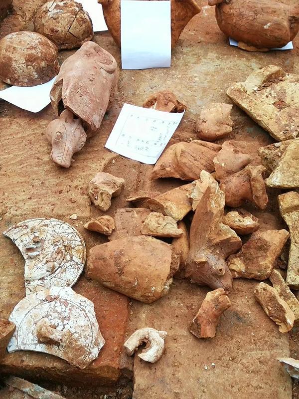 考古人员在现场捡出一些大块的碎片,推测是墓志铭,但已遭到破坏,一时无法辨认上面的文字。在工地一处呈三角形的墓穴里散落着数十件古物,有十多个罐状器皿和盖子,还有一些牛、鸡等动物形状的物品。据知情人士透露,在此工地发现了数处汉墓。