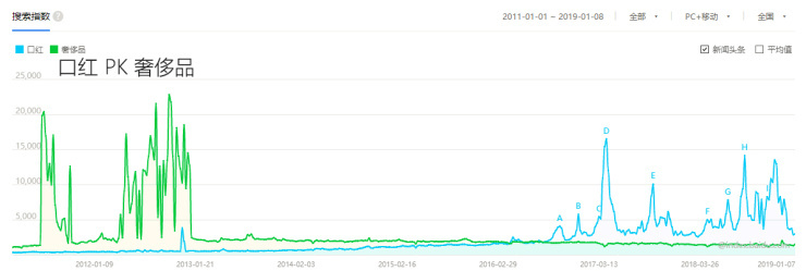 则是经济向好时的标志。从2011年至今,奢侈品的搜索峰值集中在2012年和2013年,此后搜索指数处于平稳下滑阶段,口红的搜索峰值则集中在2017年以后,整个2018年可以说峰值不断。