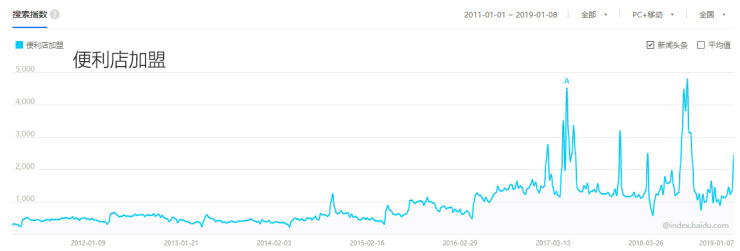 零售市场也有可能是“口红效应”的受益者,经济的不景气直接影响了消费行为,过去经常光顾的是大型的shopping mall,如今正被便利店取而代之。诸如罗森、全家等在2018年的爆红,以及被捧上风口浪尖的无人超市,或许还有泡沫的存在,但在2019年便利店的上升趋势仍将继续。这一点,也反映在了“便利店加盟”这个关键词的百度指数上。可以看到,相较于往年,2018年整年,“便利店加盟”的搜索指数始终处于高位运行。