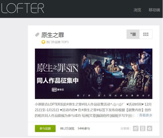 LOFTER是一个让年轻人"专注兴趣,分享创作"的互联网社区,每一个用户都能在其中凭兴趣创作,与同好交流。爱奇艺在年轻人喜欢的创作社区策划这样一场“同人作品征集活动”,通过激发网友的创作欲望,给剧集带来更高的关注度,将社区用户转化为观众。截止至2019年1月9日,活动浏览量高达88.2万次,一路攀升至LOFTER热门作品榜单TOP3。