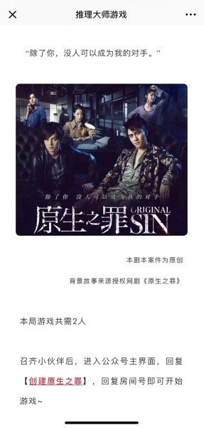 《原生之罪》更是深抓契机,与“推理大师游戏”合作定制了基于剧中人物的剧本杀游戏,并发起了线上线下组合活动。活动引发了来自无数网友的疯狂表白,更是给予受众人群一次沉浸式的体验,为观众打造身临其境于剧中的机会。在内容属性和用户定位上,《原生之罪》与“推理大师游戏”的合作是无缝契合的,产出的内容更是让二者的受众人群玩儿的尽兴,从而促进了双方受众的相互引流。