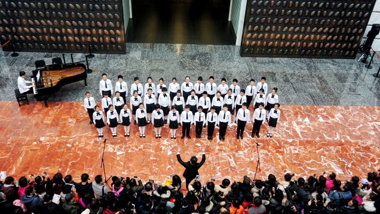上午九点,国家大剧院橄榄厅铜门在一群孩子们天籁般的歌声中正式开启。宋庆龄和平天使艺术团合唱团和北京市自忠小学合唱团带来合唱曲目《唱脸谱》《街头少年》《群星闪烁》《歌声与微笑》,天真烂漫的演唱,为观众带来满满地感动。值得一提的是,这一环节在过去的十年间,每年都是由国家大剧院合唱团的团员完成的。而今,一群活泼可爱的孩子们接到了艺术的“接力棒”,象征着艺术之火相传不息。