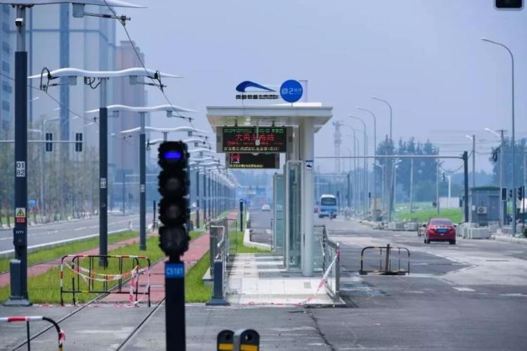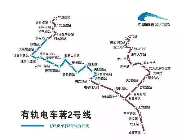 有轨电车蓉2号线是成都市区首条从市中心延伸至近郊区县的地面轨道交通线路,建成后将连接高新西区和郫都区两个区域。蓉2号线首开段起于合信路站,止于晨光站,线路总长13.7km,共12座车站,通过38个路口,线路由电子科大沿线经时代天街、华为、富士康、菁蓉小镇等到达郫都区。
