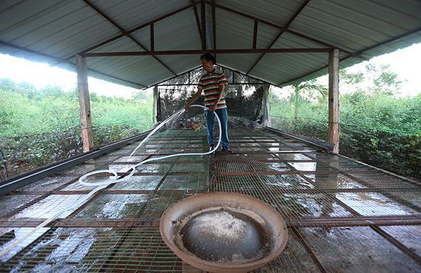 在农庄工作时,黄家光清扫农庄里的鸡舍。 视觉中国 资料图