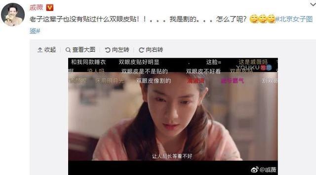戚薇因素颜出镜新剧《北京女子图鉴》,遭网友在弹幕里吐槽她的双眼皮粘的很明显、疑似整容。