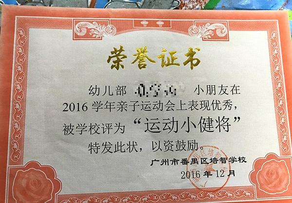 杨杨在培智学校获得的奖状 澎湃新闻记者 沈文迪 图