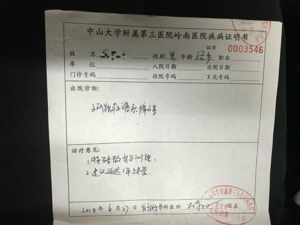 当年6月27日,黎中原跑了趟医院,开了张疾病证明书,治疗意见上写着:1,特殊教育与训练;2,建议延迟一年上小学。黎中原问医生,孩子是否可以上普通的幼儿园,医生回复可以。28日,教育局和金洲小学批准了延迟申请并盖了章。