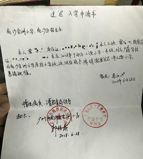 教育局和金洲小学批准了延迟入学申请书 澎湃新闻记者 沈文迪 图