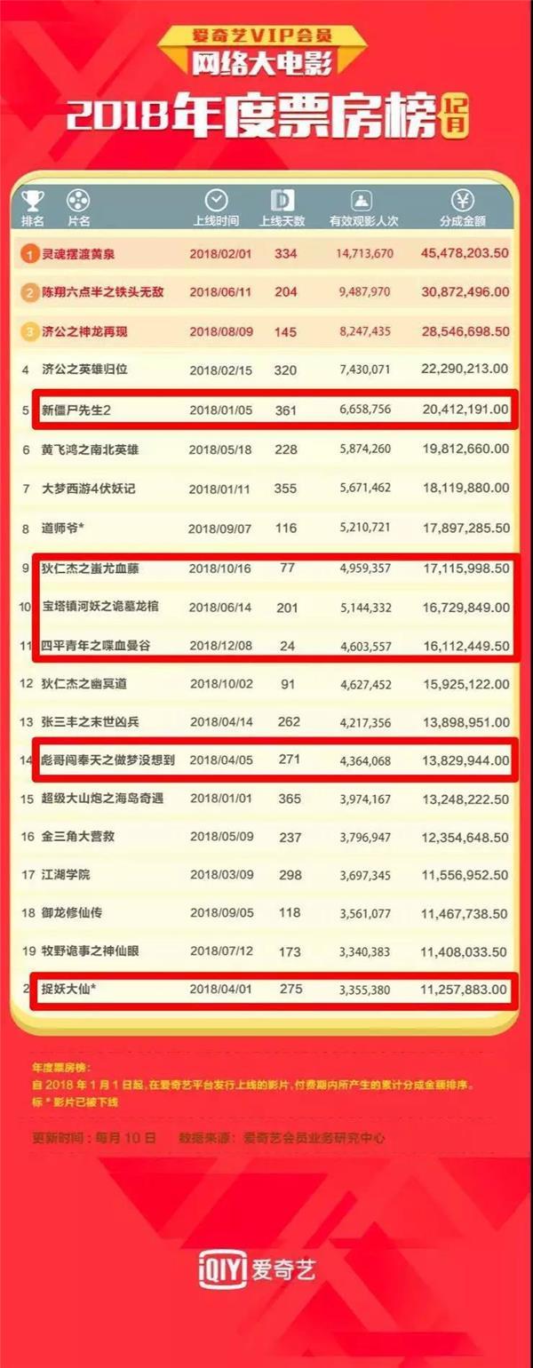 在视频平台规则的进一步明确下,2018年,爱奇艺共上线1004部网络大电影,单片票房分账突破4500万、破千万影片数量达到25部,均为历史新高。而平台下线1000余部不符合内容价值观的作品、拒绝400余部作品上线,同样为历史新高。
