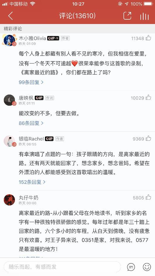 《离家最近的路》温暖的歌词、众多音乐人真诚的演唱治愈了很多听众。在网易云音乐评论区里,很多用户分享着他们对回家、故乡、亲人、朋友的故事与牵绊,截止1月31日,歌曲评论已经超过1.3万,并位居网易云音乐飙升榜首位。