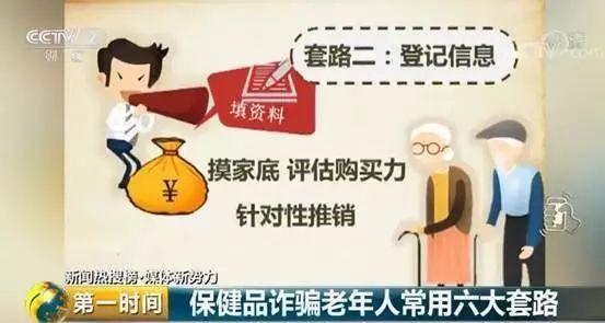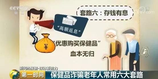 套路六:存钱有息。有些诈骗团伙还会唆使老年人把他们一生的积蓄,存在诈骗团队自己的账户,承诺高额返息,同时购买保健品,还有额外优惠,一旦您把钱存进他们的账户,就会血本无归。