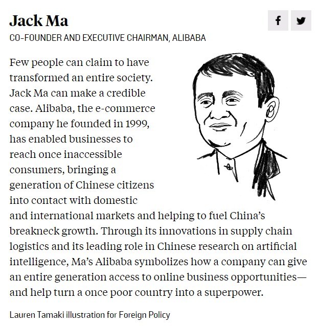 《Foreign Policy》评价道:“马云不仅极具商业思想,更是推动了脱贫、教育、环保、全球化等议题,他用行动真正改变了一个社会,更让一整代人掌握电子商务机遇,让一代中国人融入世界市场。通过在供应链上的创新,以及在中国人工智能研究领域的领先地位,马云的阿里巴巴代表着一家公司如何赋予一代人联通在线商业机会,并帮助曾经贫穷的国家成为超级大国。”