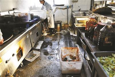 时值上午10点,厨房内正是一派忙碌的炒菜做饭景象。灶台周围的地面上遍布污水,切好的西红柿装在一个个塑料箱子内,放在厨师脚边,没有盖子。已经炒好的菜肴则盛在一个个方形的金属容器内,同样敞开放着。