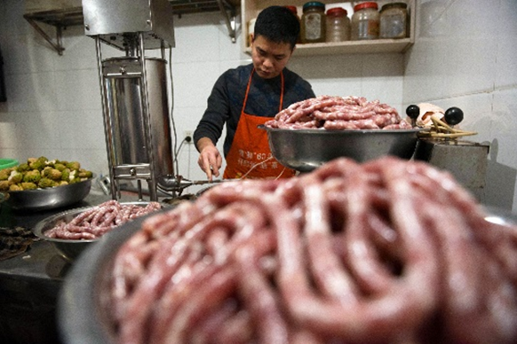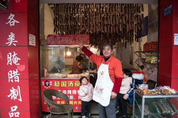 宜宾人除了爱喝五粮液、吃白肉,还少不了腊肠过年。杨国清,从年轻时候一直努力开自己的腌腊制品铺子,现在全家人都帮忙做生意:太太帮忙把各种香肠卖给客人,儿子在铺子后面坚持做手工灌香肠。