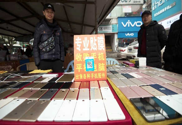 我是美国人,我不换新手机,我就换个新的手机贴膜吧!我请他们用超快速度帮我换了一个新的手机贴膜,比我在成都换还要便宜50块!这个贴膜师傅把蓝色的二维码也贴到了招牌上,意思是零钱不用找了!