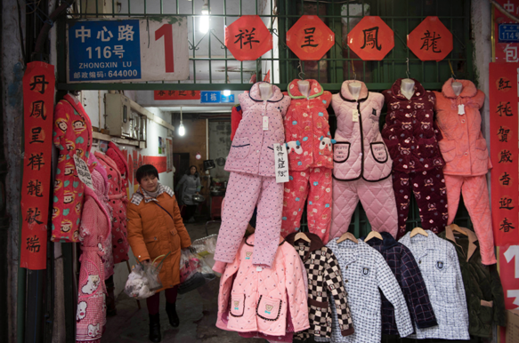在一个老公房外面,挂了很多粉色睡衣在卖。睡衣旁面挂了两条手写的春联:“祥呈凤龙“。这个用楼梯间开铺面的小店,应该就是俗话说的“螺蛳壳里做道场”,我觉得超级有意思。