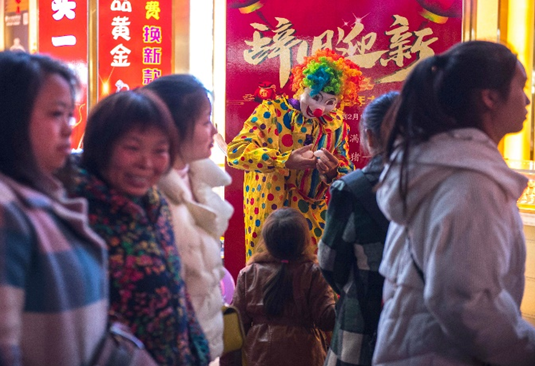这张也是年初一在一家商店看到的,小丑正在给出来妈妈带着出来逛街的小朋友气球小狗。我觉得这也很有意思,因为在西方的文化里我们看到小丑首先会想到恐怖片,里面有一个大人看不到的小丑鬼一直追一群小孩……但是在中国,过年的小丑也是小朋友喜欢的表演嘉宾。