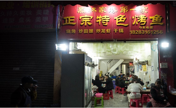 还是廿九晚上的十点钟,我和杨老师在宜宾城里走了两万步之后,终于找到了这个当地网上评价最高分的烤鱼店。那么晚,生意还很不错,里面都是年轻人在吃烧烤、喝酒、聊天。我在这里吃了四川人最喜欢的折耳根烤鱼,还吃了人生当中的第一份烤脑花!味道都很好!