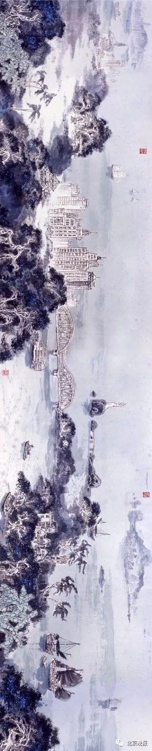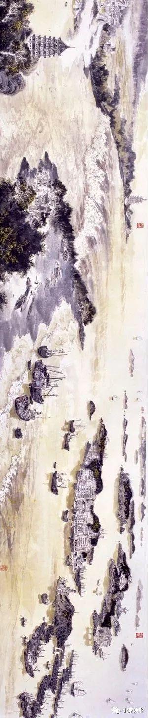该长卷是李海涛先生从1985年至1990年,行走了祖国31000多公里海疆,以五年时间创作完成的巨作,创造了中国当代美术史单幅作品创作周期最长、深入生活时间最长、行程最长的三项纪录。他对中国海疆广泛深入的人文、自然素材收集、梳理和把握,奠定其成为表现中国海洋绘画题材的学术权威。他最早出版了海洋绘画专辑和画集,确立了中国画海洋绘画奠基人的地位。
