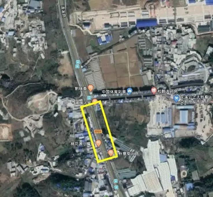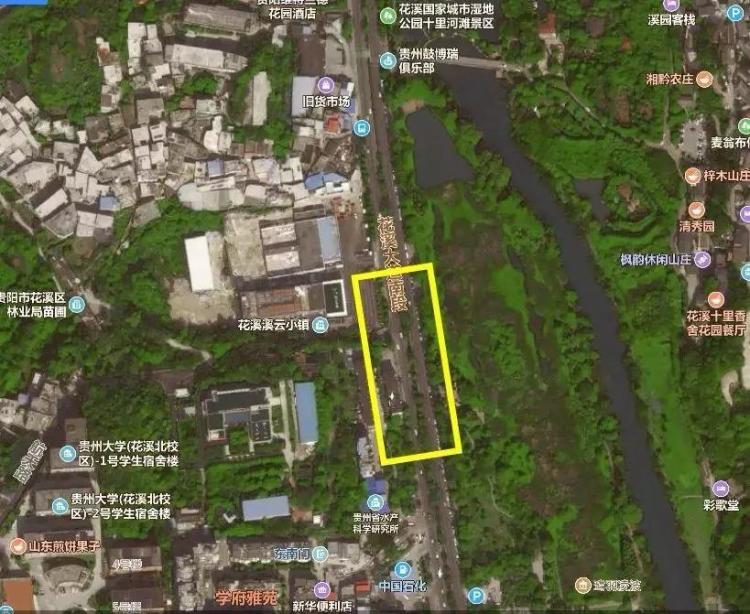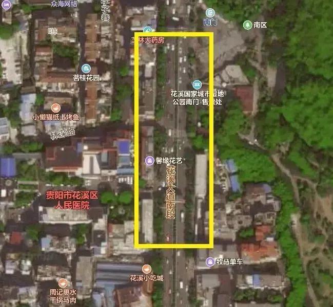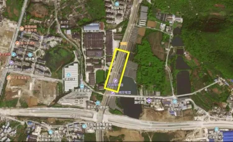 花溪南站位于清溪路与孟溪路交汇处,距离亚泰学院约 1.1km,车站东南侧为在建环铁花溪南站,直线距离约 600m。车站共设 4 个出入口(其中 1 个预留),1 号出入口与 1 号风井合设于车站主体东南端;2 号出入口位于清溪路东侧地块内,车站主体中部;4 号出入口位于清溪路西侧,车站主体西南端,3537 厂内。