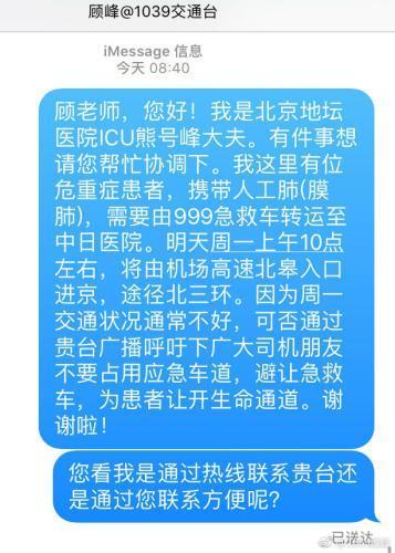 3日上午,据微博认证为北京交通台《一路畅通》节目主持人@1039顾峰发布的微博图片显示,北京地坛医院ICU熊号峰大夫向其发出求助信息。