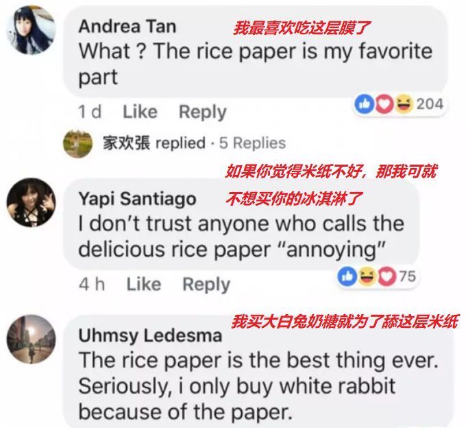 有趣的是,店家在网上“贴心”地表示,包裹着奶糖的糖膜(rice paper,用糯米纸做成)已经在产品中去掉,而评论区里的死忠们却极力反驳:糖膜才是最好吃的部分...