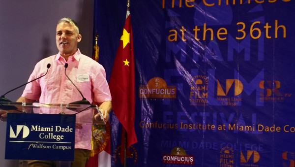 迈阿密政府代表Joshua Ho 来到现场致欢迎词,他代表迈阿密郡市政府对中国人的到来表示热烈的欢迎,对达德孔子学院、迈阿密电影节组委会以及香港丝路卫视联合主办本届活动表示热烈的祝贺,同时也希望通过电影与文化的交流的平台,迈阿密能够更多地与中国各个方面,包括经济,文化教育进行多方面深入的交流和合作,也祝愿来自中国的电影人在迈阿密逗留期间顺利和愉快。