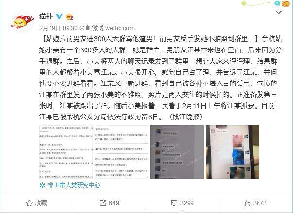 根据钱江晚报报道,余杭姑娘小美是个超300人大群的群主,而她的前男友江某曾经是群成员。今年1月,江某提出分手后就退了群。仍对前男友不死心的小美将两人春节期间吵架的微信聊天记录发到了群里让网友评理,还“作死”般拉江某再入群围观自己被网友不堪入目的脏话骂成“渣男”。于是江某出其不意地反手就发了两张小美的不雅照到群里,正要发第三张时被踢出群。随后,小美报警,而江某于2月11日被警方抓获并被依法行政拘留8日。