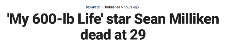 美国TLC电视台真人秀节目“沉重人生”(My 600-lb Life)的“明星嘉宾”——600磅重的Sean Milliken被曝去世,年仅29岁。